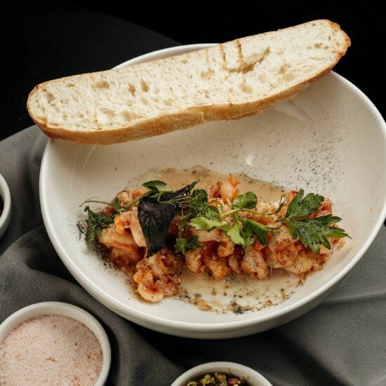 Гренки из бородинского хлеба, креветки темпура, судак в кляре, картофельные чипсы собственного приготовления, белый соус