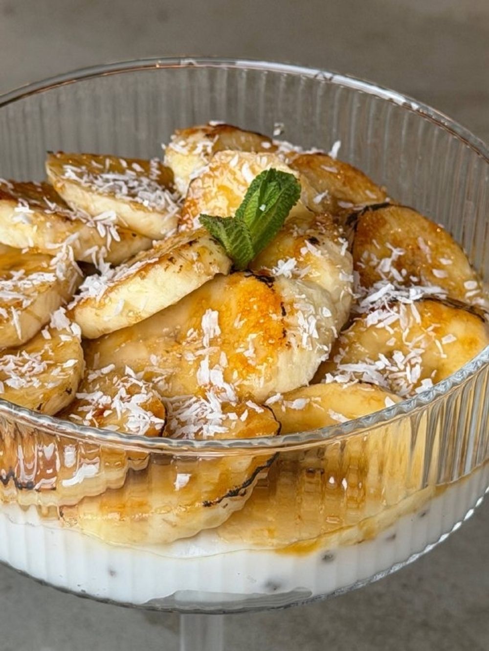 Десерт на кокосовом молоке с семенами чиа и карамелизированным бананом
